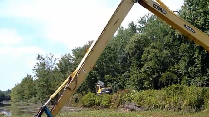 挖掘机清理水塘淤泥,这机械臂可真长啊!