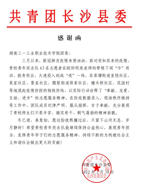 一封感谢函!三一职院学子显担当
