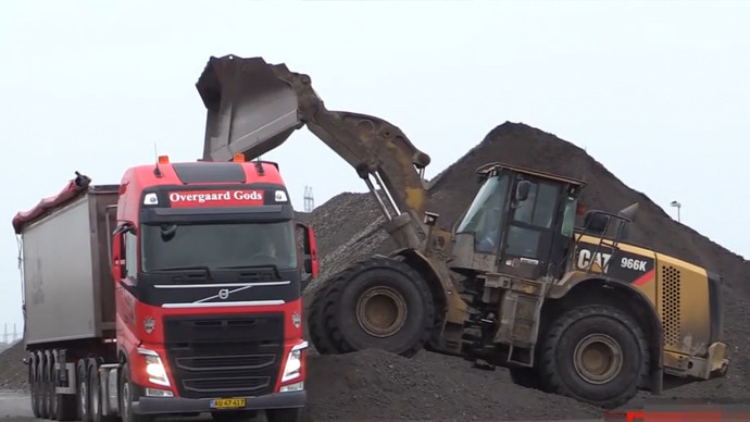 实拍:沃尔沃轮式装载机给重型卡车装载沥青