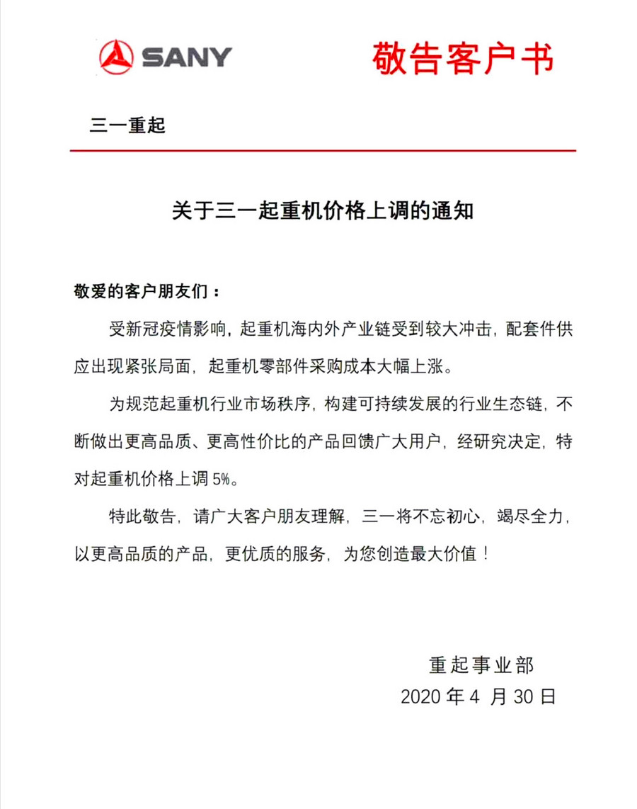 涨价通知:三一重起宣布起重机价格上调5%