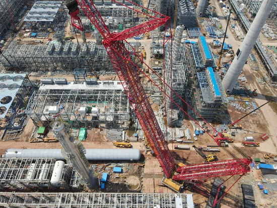 三一红色巨无霸SCC40000A即将完成790吨脱异丁烷塔吊装就位