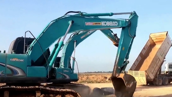 两台挖掘机装一辆货车,什么牌子的挖掘机