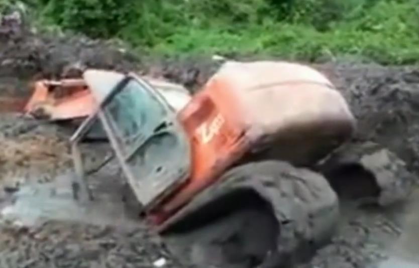 挖掘机陷车成这个样子了还在挣扎,感觉救上来也要报废!