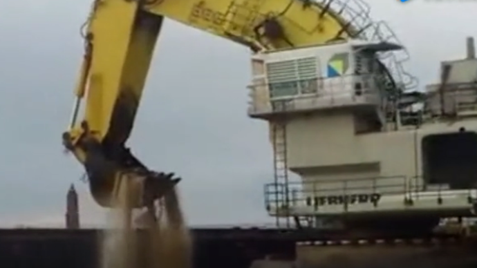 探入水中的大型挖掘机械臂挖掘怎样时的场景