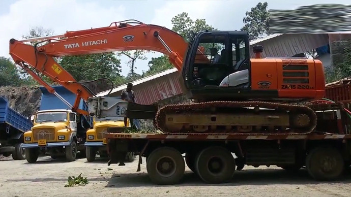印度实拍,卡车运输挖掘机,塔塔日立挖机下车过程