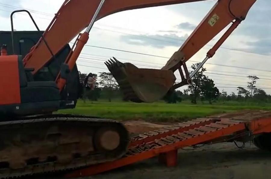 实拍印度卡车运输挖掘机,看看日立挖机如何下车的?