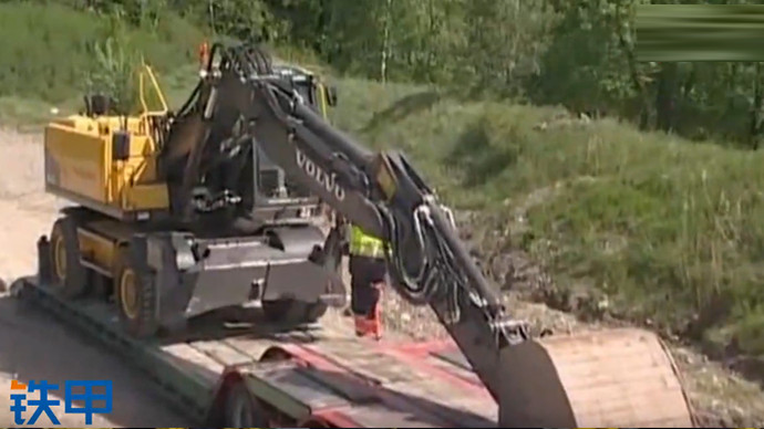 上板车 首先要把履带跟车平行 慢慢上,不能图快,不能着急,视频里的学徒上车有点着急,也有点不熟练 如果是小挖机一定要将推土铲放前面上 视频里是爬梯,基本现在都是这种,如果不是爬梯就得先把挖机撑起来挖机
