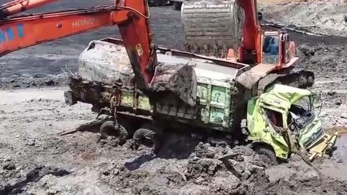 能把日野货车开成这个破烂样,2位挖掘机司机都服了你!