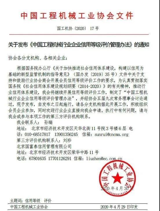 关于发布《中国工程机械行业企业信用等级评价管理办法》的通知