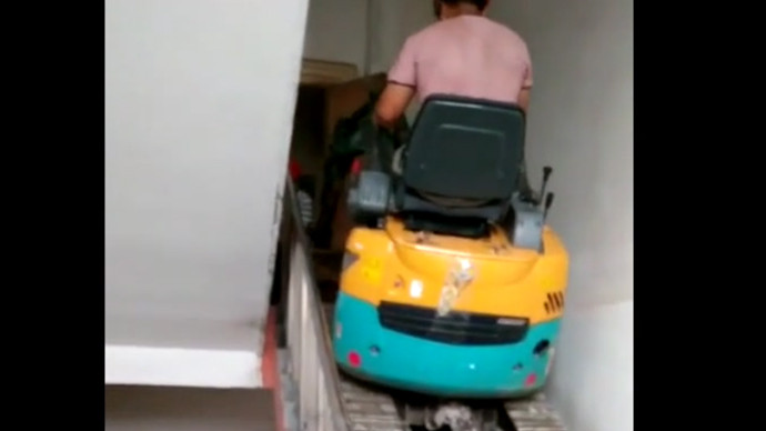 厉害了,蓝翔的都这么厉害吗?挖机都开到楼道里了