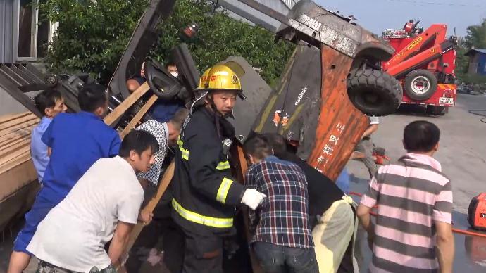 水泥搅拌车侧翻压人 两叉车司机抬车营救