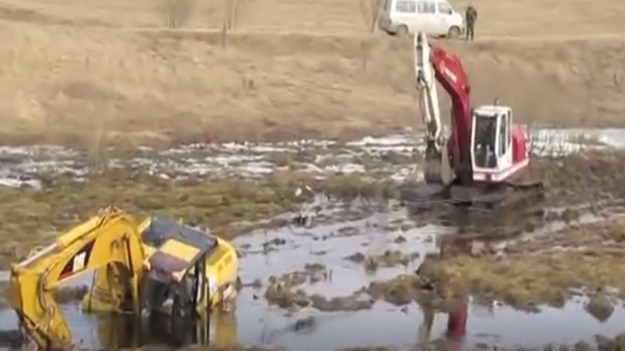 湿地生生的吞噬了一台卡特挖掘机,亏大了,这一年的工程白干了