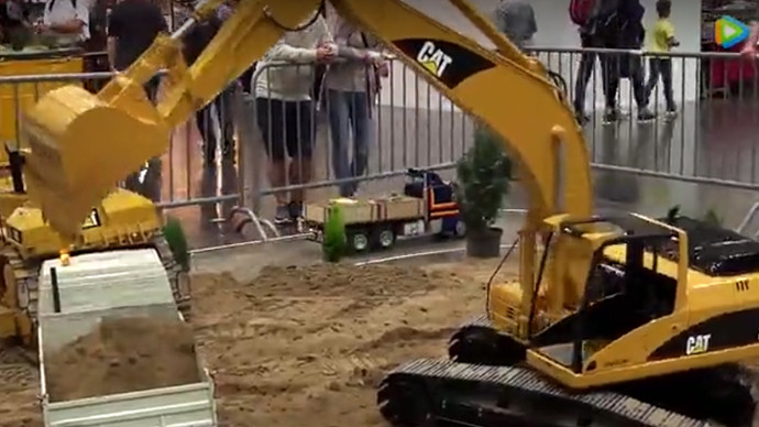 重型运输卡车拖家带口,一架卡特挖掘机和两架卡特推土机
