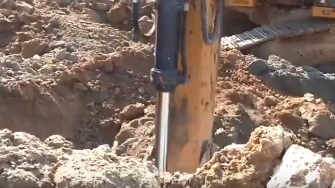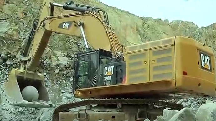 这块石头太大,就算是卡特390挖掘机,也照样拿它没办法