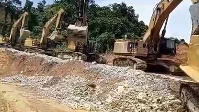 这块石头太大,就算是卡特390挖掘机,也照样拿它没办法