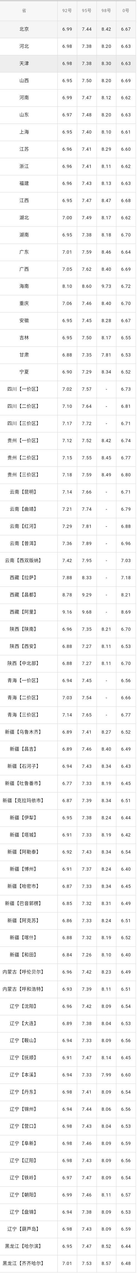 全国油价调整信息:6月1日调整后:全国92、95号汽油价格表