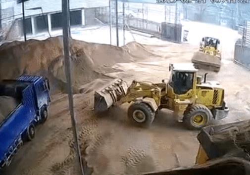 事故警示:铲车一铲子把人带沙子铲起来放进了进料口