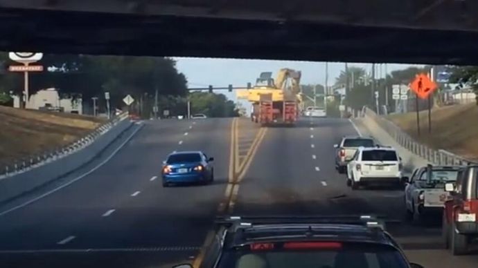 这些板车载的挖掘机撞天桥后,司机都直接开走了,为什么?