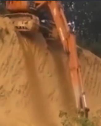 挖掘机失误!垂直悬崖上作业,山体滑坡直接将其淹没!