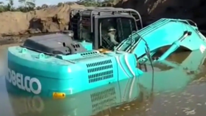 挖掘机大沽河边偷采沙 压垮堤坝掉进河中(图)