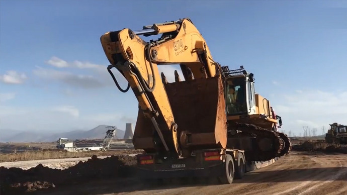 德国曼恩拖车运输巨无霸挖掘机,挖机这样停着不怕掉?