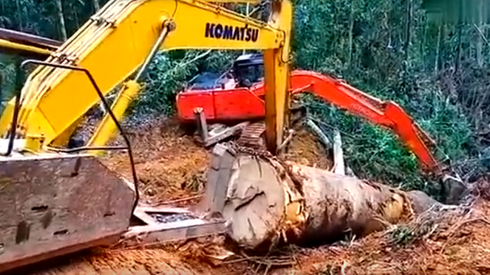 又涨知识了,两台挖掘机相互配合,这么粗的木头,也能拽出来!