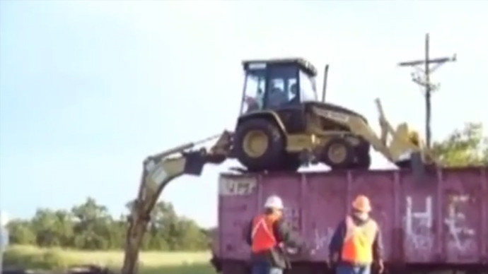 实拍国外挖掘机爬火车上卸货太硬核,还知道给自己搬个凳子!