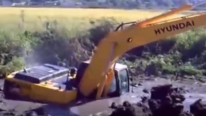 拖拉机下泥沟玩越野,结果需要挖掘机来救援