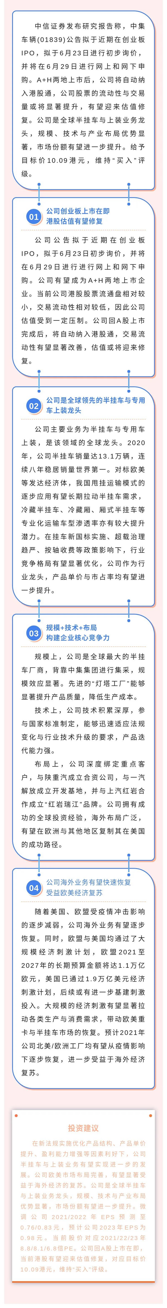 中信证券:中集车辆(01839)创业板IPO在即 目标价提升至10.09港元