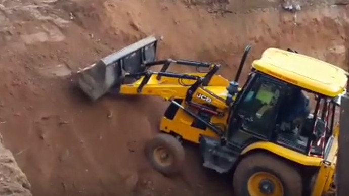 国外小朋友脚够不着油门,还是把挖掘机开走了