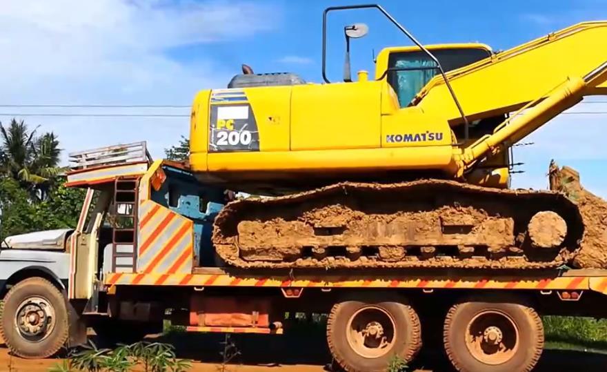 板车运输挖掘机,看看小松PC200挖机如何下车的