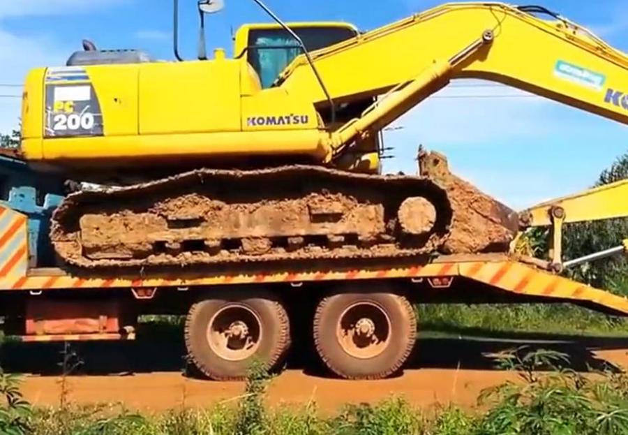 板车运输挖掘机,看小松PC200挖机是如何下车的