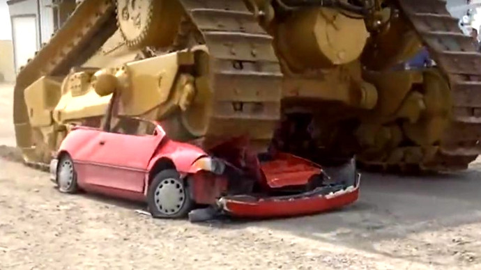 小轿车在大推土机前面就是一只蚂蚁,一压成饼!