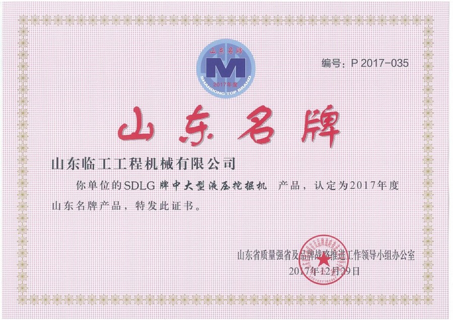 山东临工中大型液压挖掘机荣获山东名牌产品
