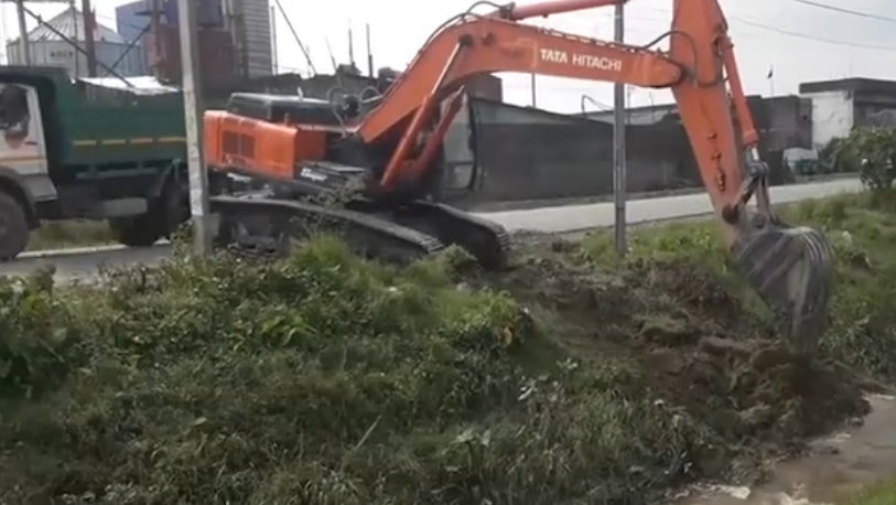 新手开日立挖掘机过水沟,竟然还要铺好路才敢过去!