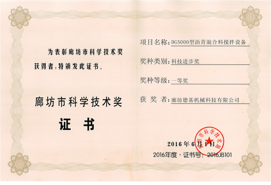 德基机械荣膺“廊坊市科学技术进步奖”一等奖