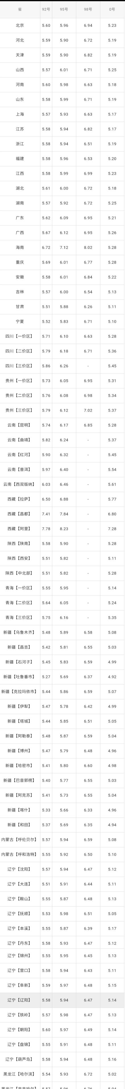 全国油价调整信息:6月9日调整后:全国92、95号汽油价格表
