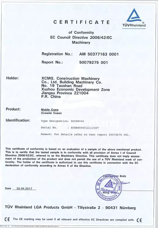 进军高端市场 徐工XGC88000喜获欧盟CE证书