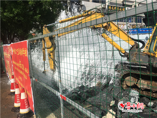 张店潘南路挖掘机施工凿破自来水管形成“喷泉”