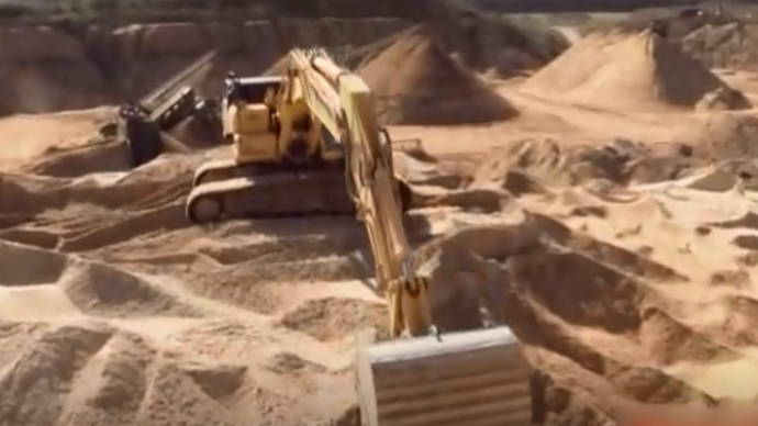 老司机开挖掘机挖沙作业,感觉是在玩过家家的游戏