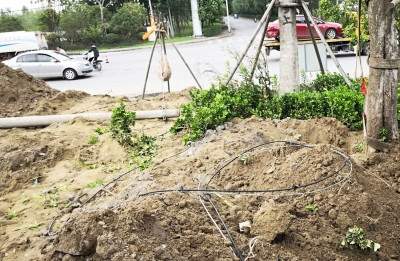 挖掘机扯倒水泥线杆砸伤绿化女工 线缆耷拉到路上又引发车辆追尾