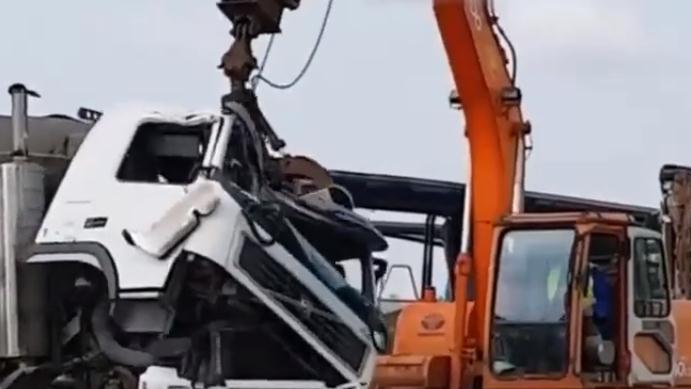 挖掘机换上一个机械抓手,把一辆报废的大卡车拆成了零件