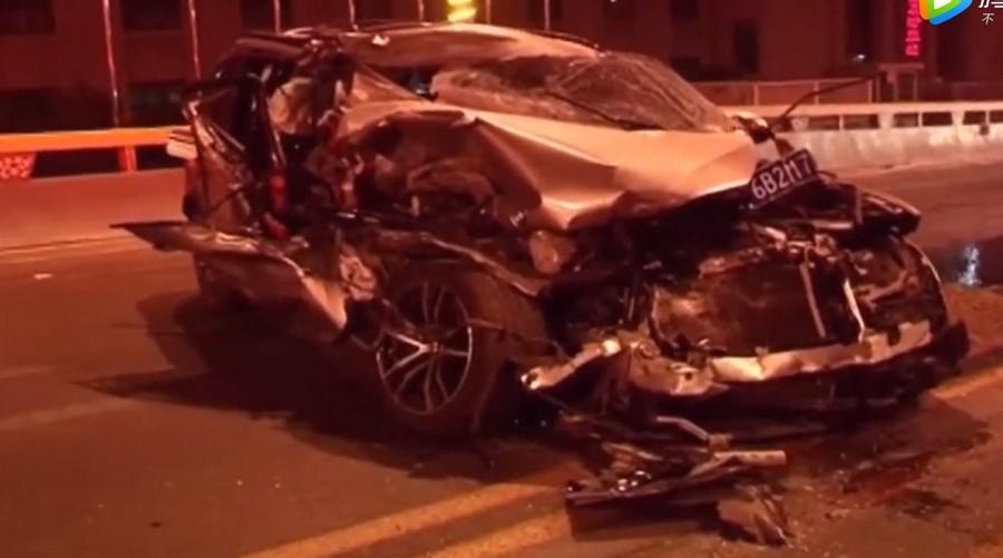 宝马撞到施工车辆,现在一片狼藉,事故原因正在调查中