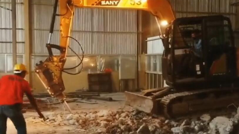 室内挖掘机碎水泥板作业,包工头真大胆靠这么近指挥!