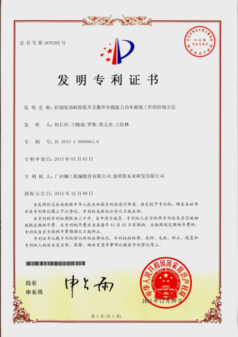 柳工首项发动机发明专利获国家授权