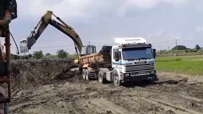 满载大货车跑不动,只好请挖掘机来拖着它走!