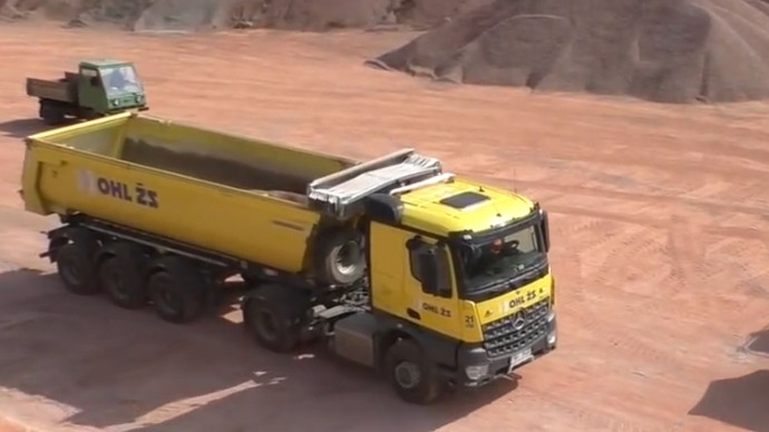 奔驰双节车厢卡车卸货,这个小装置设计的真好,卸料方便