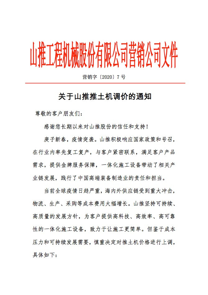 山推宣布推土机、压路机、平地机全系列产品涨价!