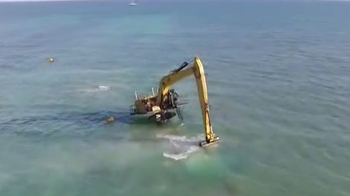 奇葩挖掘机土豪老板真任性,开着挖机去海边玩泥巴!
