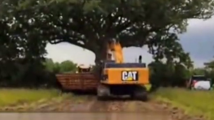 【热门】三台挖掘机两台推土机运输一颗大树,场面太震撼